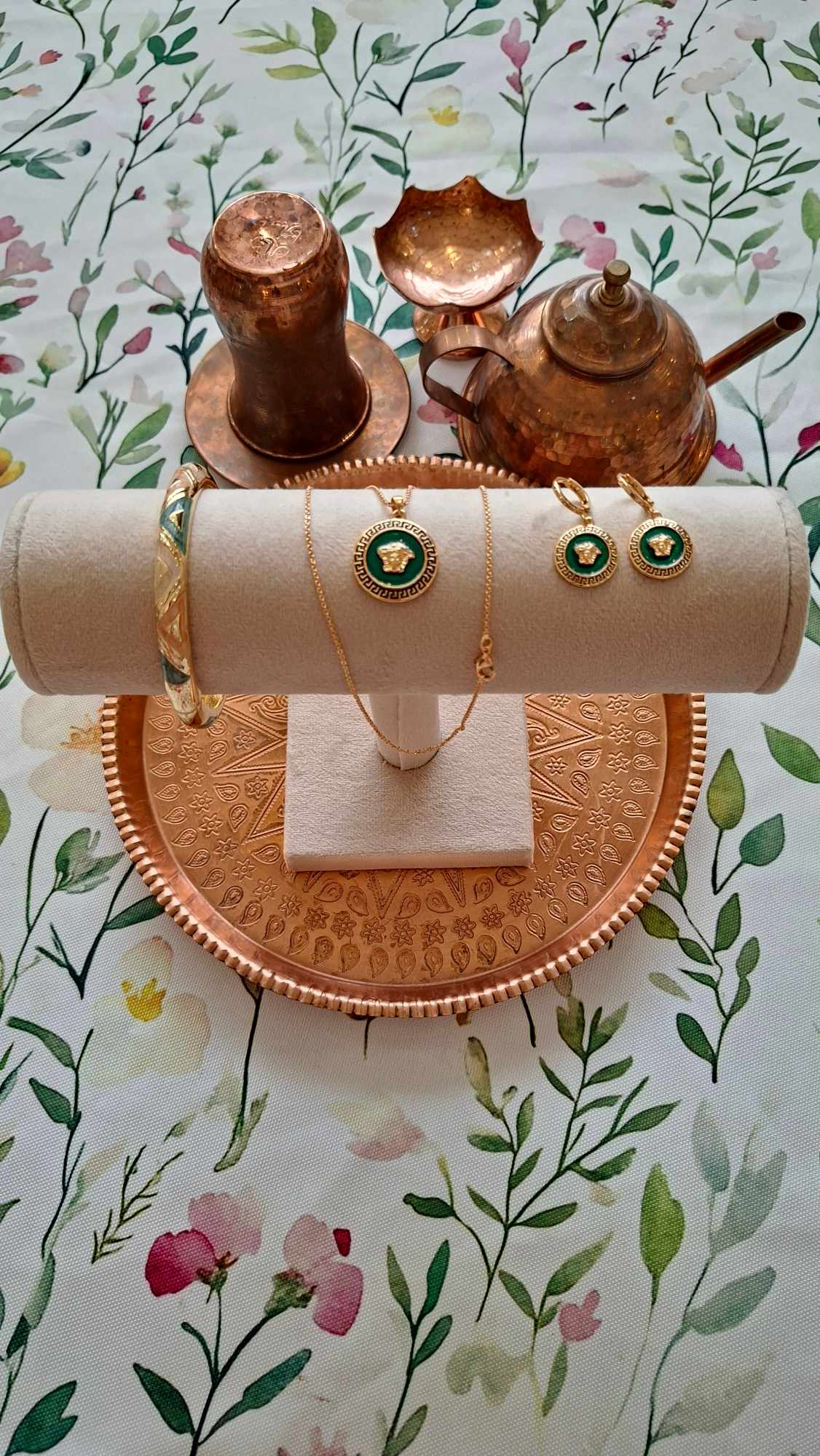 نیم ست ورساچه مجلسی مارک YSX، رنگ سبز و طلایی، بسیار عالی و چشمگیر و نما دار، مناسب استفاده روزانه و رنگ ثابت و با کیفیت بالا، استیل ضد زنگ
